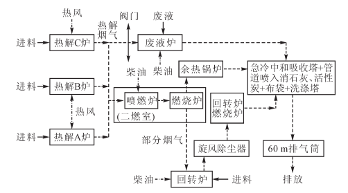 1、焚烧系统处置流程。热解气化燃烧系统主要即一燃室热解气化炉和二燃室燃烧炉组成,采用柴油作为助燃剂。热解气化炉(A、B、C 炉)交替循环使用,其中热解气化炉(C 炉)与废液炉并联(C 炉产生的高温烟气替代一次能源用于废液炉的废液加温燃烧)。回转炉焚烧系统燃烧烟气首先通过旋风除尘器进行初级除尘,后引入回转炉燃烧炉二燃室中进一步燃烧,产生的烟气进入焚烧废气处理系统。回转炉采用柴油助燃,并引入热解气化炉二燃室部分烟气作为燃烧热源。回转炉二燃室设计温度控制在 1100 ℃,烟气停留时间为 2s 以上。废液由废液喷头喷入废液炉内进行雾化燃烧,燃烧燃气经余热炉换热回收热水后进入焚烧废气处理系统。废液炉采用柴油作为辅助燃料,并配置串联热解炉(C 炉)产生高温烟气替代一次能源。废液炉设计温度控制在 1100 ℃,烟气停留时间为 2s 以上。